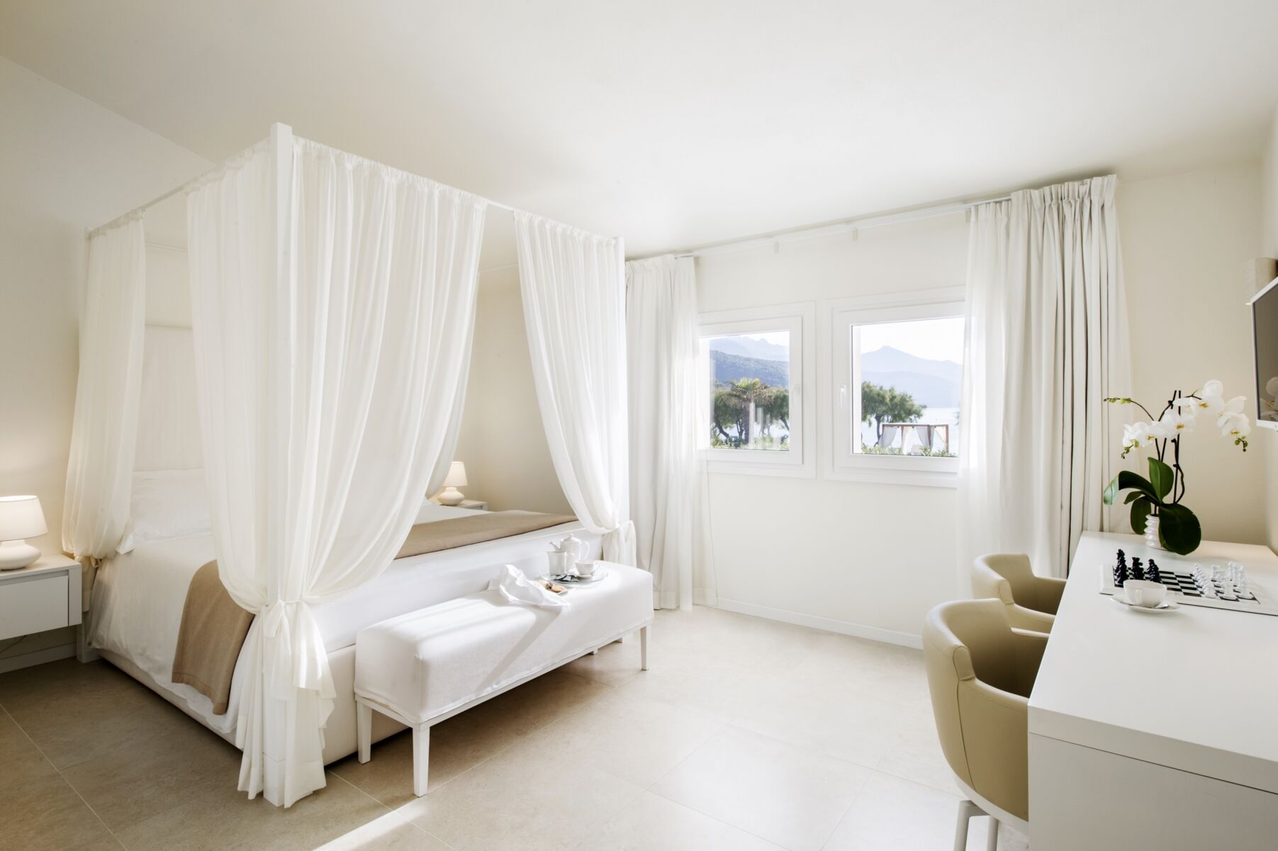 Le suites del Baia Bianca sono arredate con gusto e con una spiccata attenzione ai dettagli, con particolari finiture di un moderno design che esalta il bianco e contribuisce a creare un’atmosfera lussuosa è piacevole. E per deliziare il palato degli ospiti il ristorante Bistrot con la sua fantastica terrazza dove potersi gustare un tramonto sul mare.