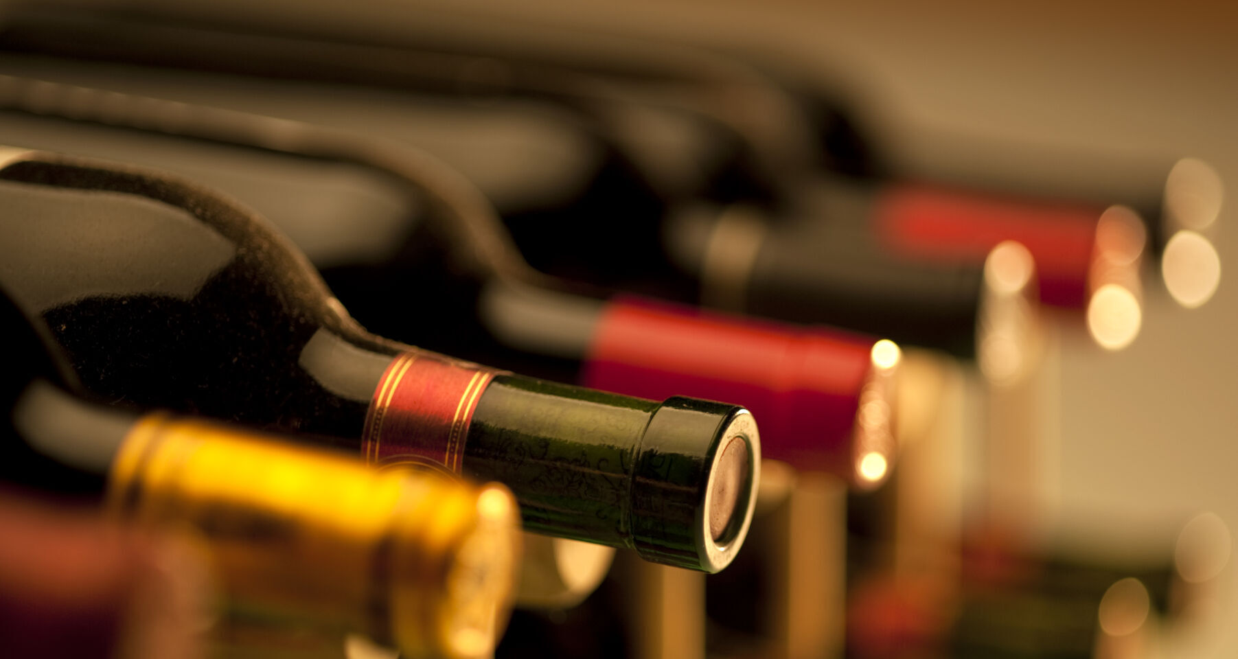 Red wine bottles stacked on wooden racks shot with limited depth of field